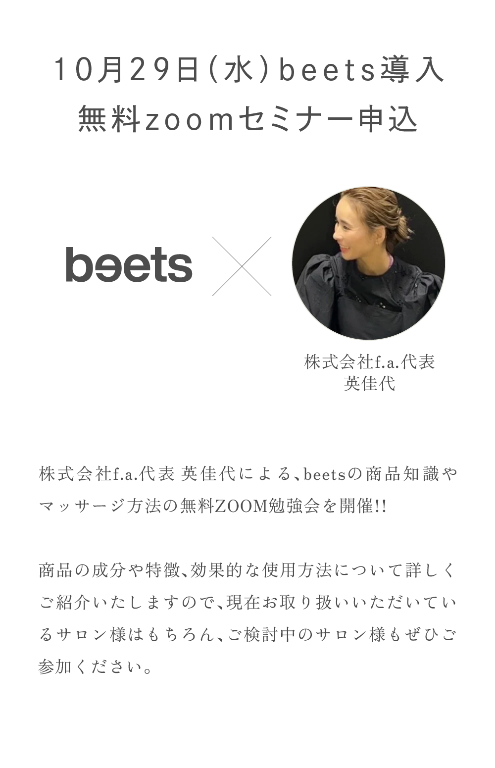 株式会社f.a.代表 英佳代による、beetsの商品知識やマッサージ方法の無料ZOOM勉強会を開催!!