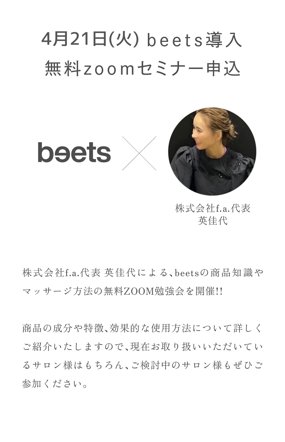 株式会社f.a.代表 英佳代による、beetsの商品知識やマッサージ方法の無料ZOOM勉強会を開催!!